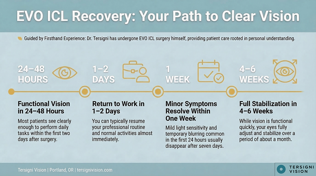 For Portland patients considering EVO ICL, recovery planning is one of the many factors Dr. Tersigni evaluates during the 90-minute Tersigni Vision Advanced Ocular Analysis. To learn whether EVO ICL fits your vision, prescription, and lifestyle, contact Tersigni Vision at (971) 362-2020.